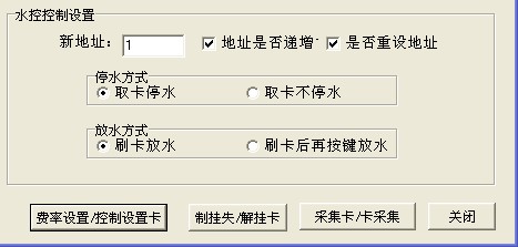 2 水控控制設置:新地址設置為1,把地址號是否遞增和是否重設機器號前面的選項選上,如下圖所示,點擊費率設置|控制設置卡按鈕,點擊控制設置卡, 即可成功制作成控制設置卡去修改聯(lián)網型水控一體機的機器號。控制設置卡在機器上數卡成功時會提示8 OK 9 OK 10 OK