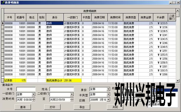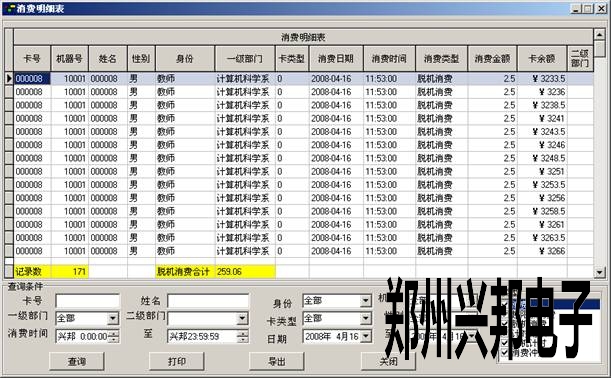 1) 消費(fèi)明細(xì)表:根據(jù)相應(yīng)條件查看卡的消費(fèi)明細(xì),表里顯示了卡的一些基本信息和消費(fèi)的時(shí)間,金額和卡上還有的余額。