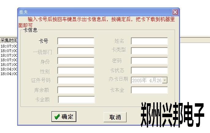 輸入卡號,然后按回車鍵,卡里面所存入的信息都會顯示出來,然后點確認,會出現一個掛失成功的提醒。這時,卡就掛失成功了。如果不知道卡號,可以在卡信息表時根據姓名,證件號等來查詢卡號,然后再操作上面的這一步。