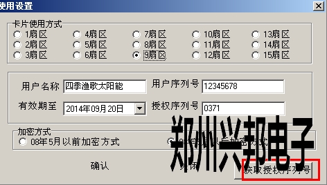 2.雙擊后出現下圖所示的界面,點擊該界面右下角的【獲取授權序列號】按鈕,即可讀出當前數據庫中的設置,包括 使用扇區、用戶名稱、用戶序列號、授權序列號、加密方式