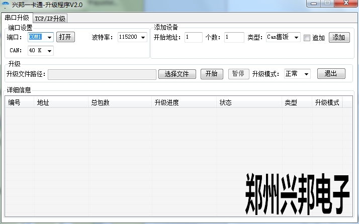 第三步:終端設(shè)備從應(yīng)用程序進(jìn)入升級(jí)界面后,關(guān)掉興邦在線升級(jí)工具后,重新打開興邦在線升級(jí)工具,并做以下配置:配置興邦在線升級(jí)工具中相應(yīng)的端口、波特率19200、開始地址設(shè)為1、個(gè)數(shù)項(xiàng)為1、類型選擇終端門禁一體機(jī)、升級(jí)模式選擇正常,點(diǎn)擊添加按鈕后、選擇相應(yīng)的文件,再點(diǎn)擊開始按鈕即可;直到升級(jí)完成。