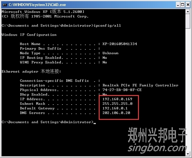 4.我們可以看到紅色方框內就是我們所要查看的IP地址、網關、和dns了。