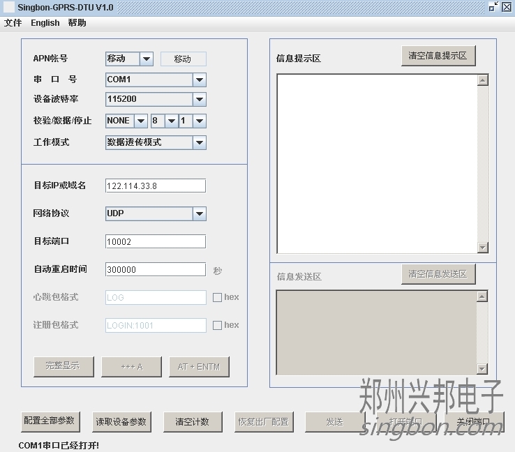 將編程器TR101插入GPRS配置接口,打開配置工具,選擇相應串口,點擊“讀取設備參數”。