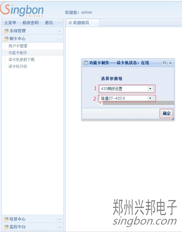 在上圖中,方框1處參數組選擇“433頻段設置”,方框2處是供用戶選擇的信道,用戶選擇好需要使用的信道后,在綁定的讀卡機上放一張相同參數未發行的卡片,點擊“確定”按鈕后功能卡制作成功。用制作好的功能卡在機器的刷卡處刷卡,從而修改機器的信道。