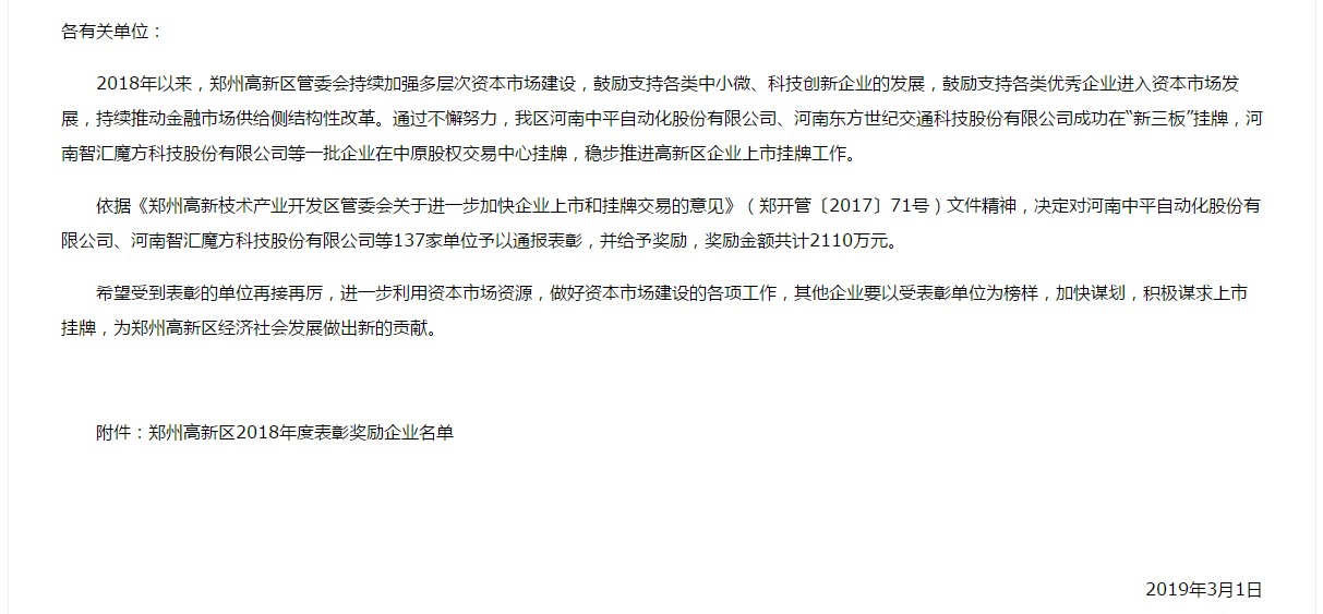 轉發:鄭州高新技術產業開發區管委會關于表彰鄭州高新區2018年度多層次資本市場企業的決定