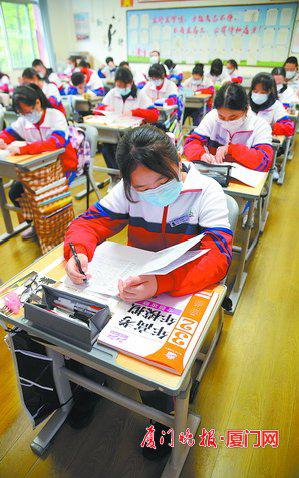 廈門網(wǎng)訊(廈門晚報(bào)記者郭文娟林珊吳笛圖/劉東華)今天早上,全市近1.6萬名高三學(xué)生重返課堂。距離高考只有三個(gè)月了,老師勉勵(lì)學(xué)子們:“寧吃百日苦,不留終生憾!”校園里張貼的紅色標(biāo)語(yǔ),也為學(xué)生們加油鼓勁:“努力到無能為力,拼搏到感動(dòng)自己!”